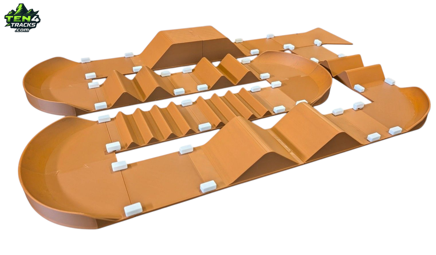 Clay Brown - Toy Supercross Starter Kit includes 24 modular track pieces, including tabletop sections, whoops, doubles, and berms, crafted from durable, non-toxic PLA.