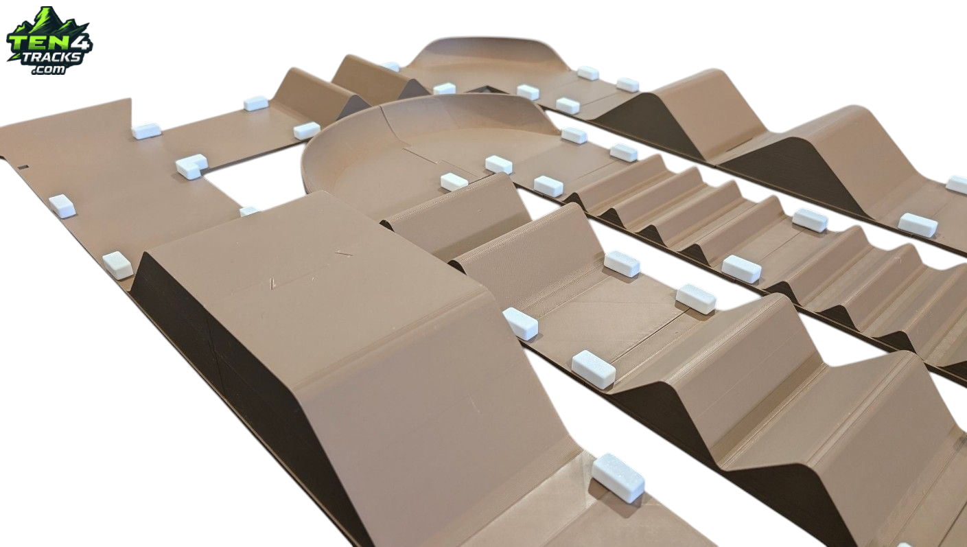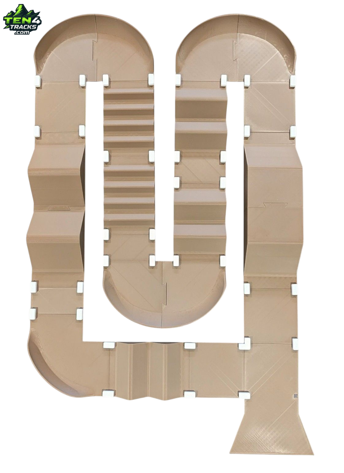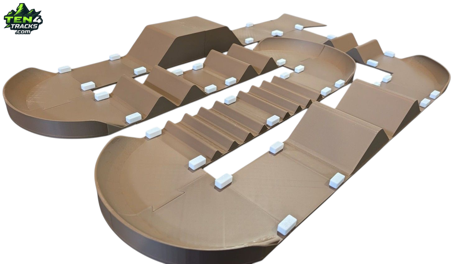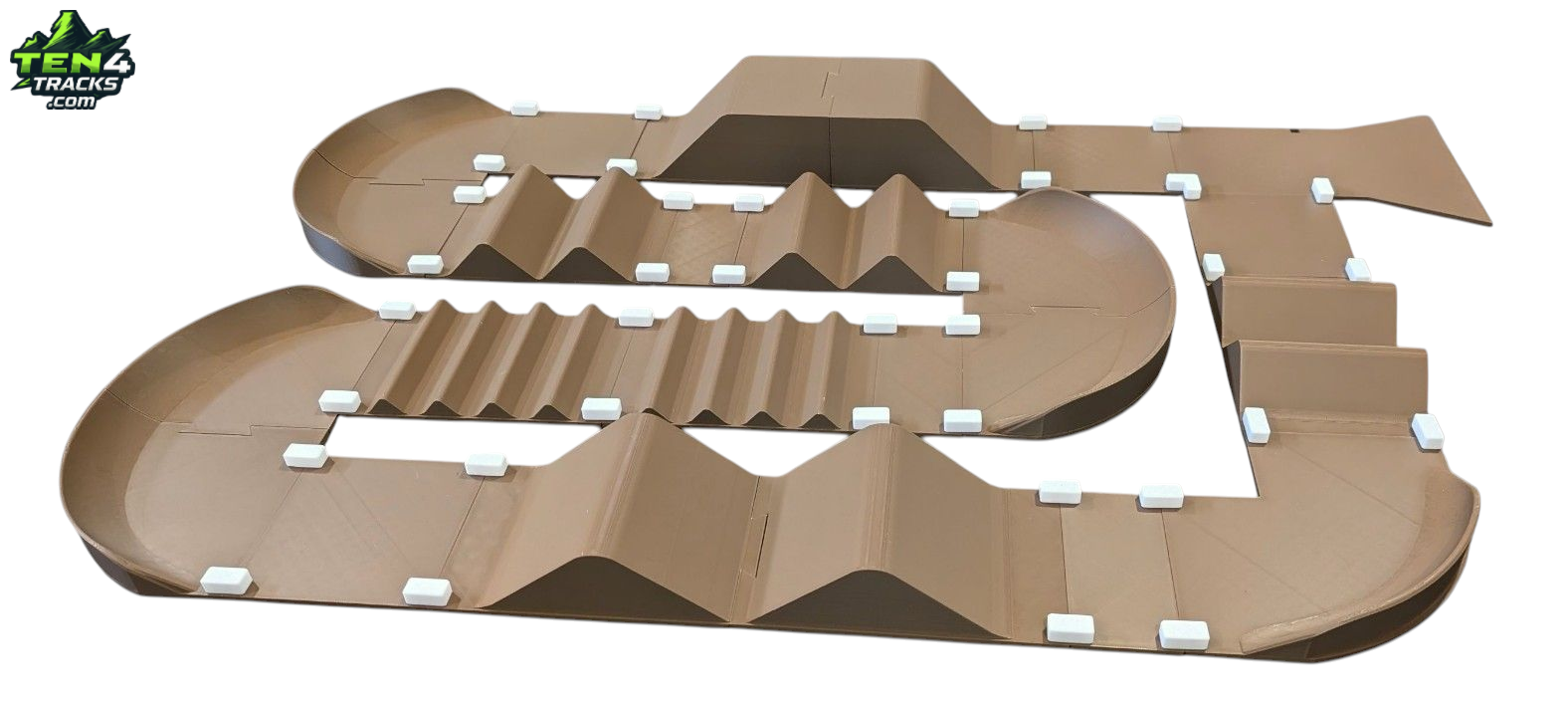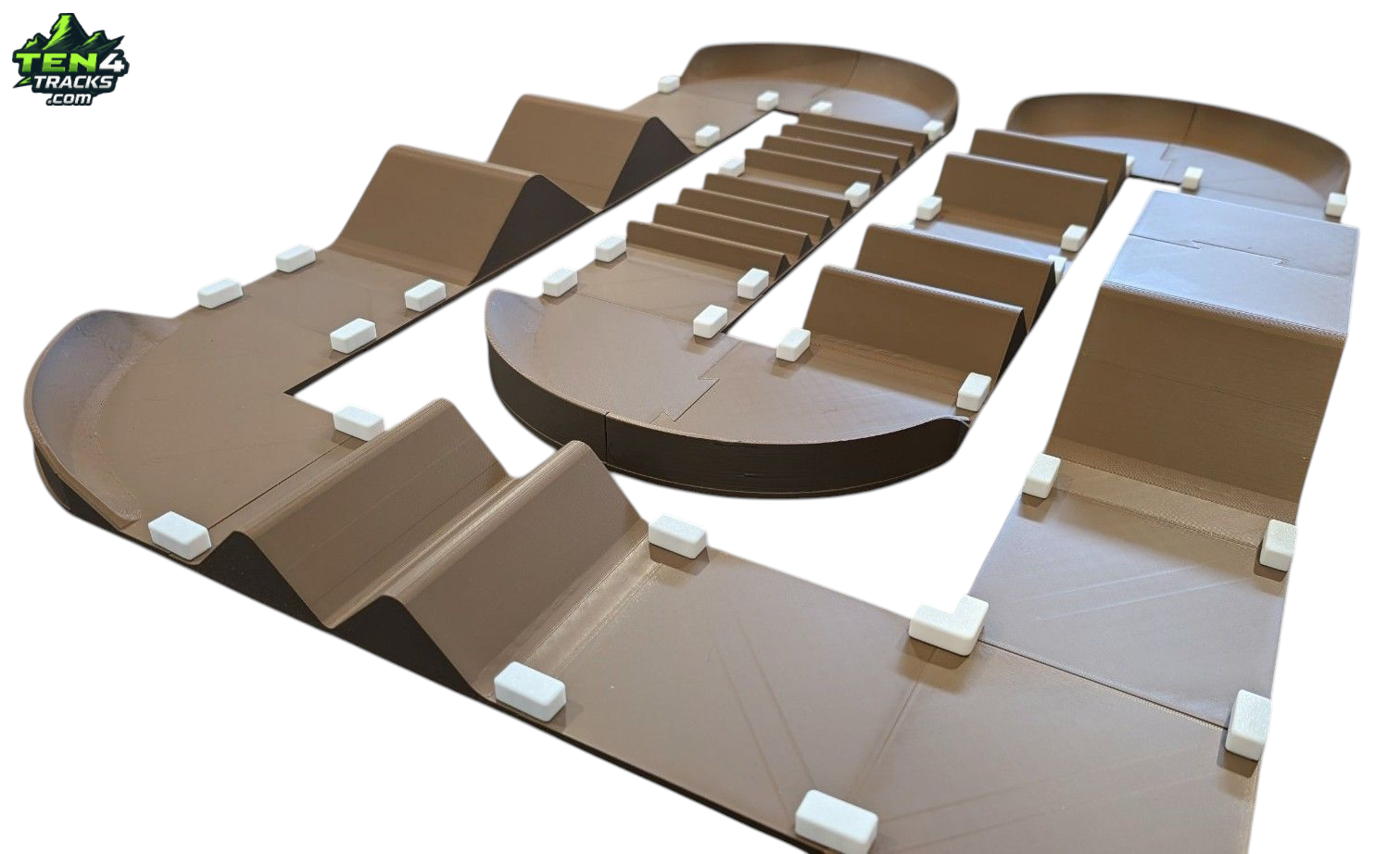 Dirt Brown - Toy Supercross Starter Kit includes 24 modular track pieces, including tabletop sections, whoops, doubles, and berms, crafted from durable, non-toxic PLA.